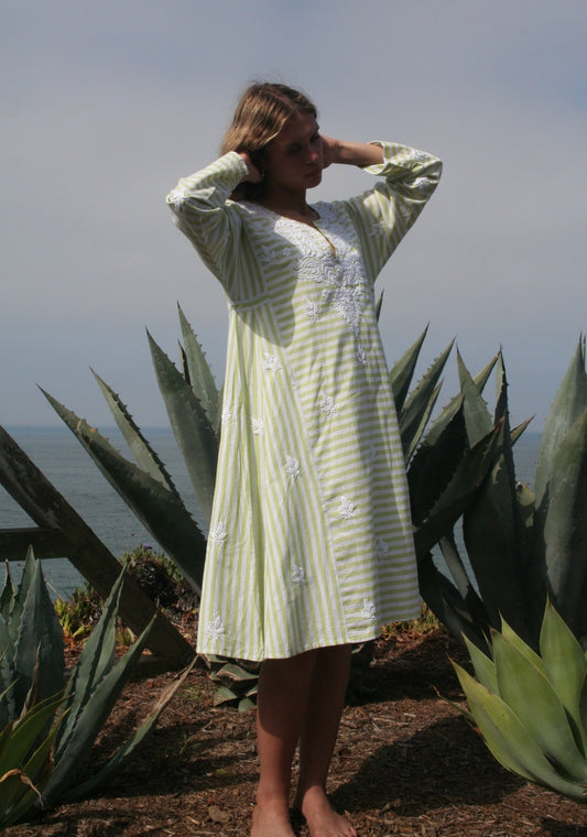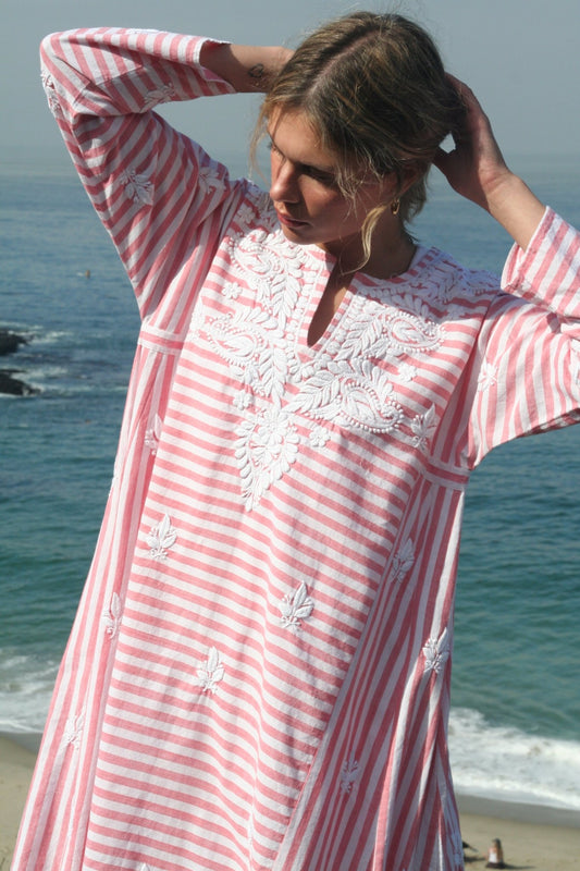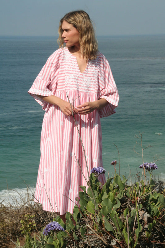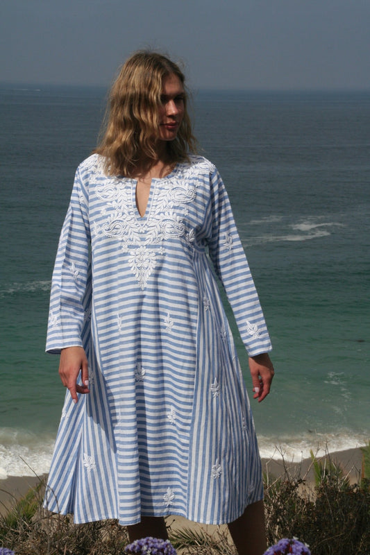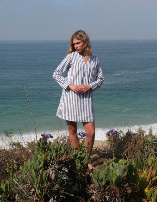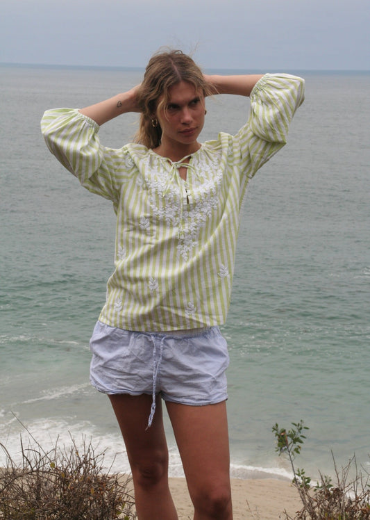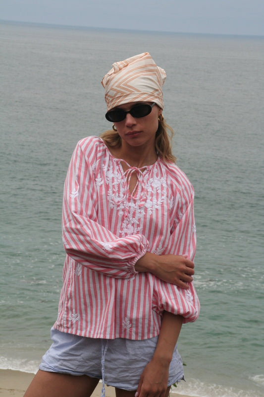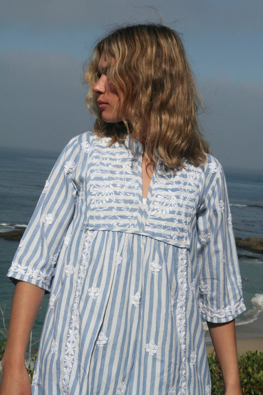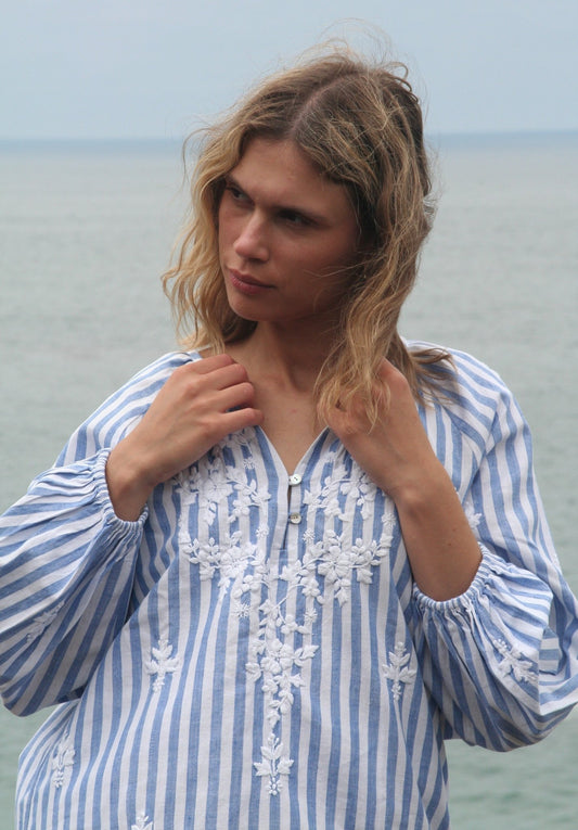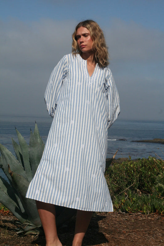 Inspired by the subtle stripes of Provence, this collection evokes the timeless charm of the French Riviera. Each piece is adorned with delicate hand embroidery—traditional yet sophisticated, classic yet modern. Whether you're strolling through coastal towns or city streets, the spirit of the Riviera travels with you.